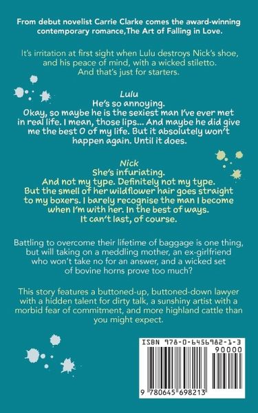 It's irritation at first sight when Lulu destroys Nick's shoe, and his peace of mind, with a wicked stiletto. And that's just for starters. Lulu He's so annoying. Okay, so maybe he is the sexiest man I've ever met in real life. I mean, those lips... And maybe he did give me the best O of my life. But it absolutely won't happen again. Until it does. Nick She's infuriating. And not my type. Definitely not my type. But the smell of her wildflower hair goes straight to my boxers. I barely recognise the man I become when I'm with her. In the best of ways. It can't last, of course. Battling to overcome their lifetime of baggage is one thing, but will taking on a meddling mother, an ex-girlfriend who won't take no for an answer, and a wicked set of bovine horns prove too much? This spicy romance features a grumpy, cinnamon-roll lawyer with a hidden talent for dirty talk, a sunshiny artist with a morbid fear of commitment, and more highland cattle than you might expect. Don't miss The Art of Falling in Love, winner of the Romance Writers of Australia Best Unpublished Manuscript 2022, by debut novelist Carrie Clarke.