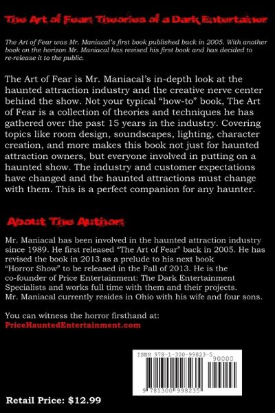The Art of Fear was Mr. Maniacal's first book published back in 2005. With another book on the horizon Mr. Maniacal has revised his first book and has decided to re-release it to the public. The Art of Fear is Mr. Maniacal's in-depth look at the haunted attraction industry and the creative nerve center behind the show. Not your typical "how-to" book, The Art of Fear is a collection of theories and techniques he has gathered over the past 15 years in the industry. Covering topics like room design, soundscapes, lighting, character creation, and more makes this book not just for haunted attraction owners, but everyone involved in putting on a haunted show. The industry and customer expectations have changed and the haunted attractions must change with them. This is a perfect companion for any haunter.