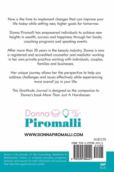 Now is the time to implement changes that can improve your life today while setting new, higher goals for tomorrow. Donna Piromalli has empowered individuals to achieve new heights in wealth, success and happiness through her books, coaching programs and speaking events. After more than 30 years in the beauty industry, Donna is now a registered and accredited counsellor and mediator working in her own private practice working with individuals, couples, families and businesses. Her unique journey allows her the perspective to help you address challenges and issues effectively while experiencing more overall joy in your life. This Gratitude Journal is designed as the companion to Donna's book More Than Just A Hairdresser.