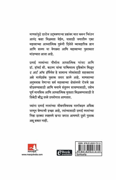 This is the Marathi translation of THE ART OF HAPPINESS. In this unique and important book, one of the world's great spiritual leaders offers his practical wisdom and advice on how we can overcome everyday human problems and achieve lasting happiness. Covering all key areas of human experience, His Holiness the Dalai Lama and Howard Cutler apply the principles of Tibetan Buddhism to everyday problems and reveal how one can find balance and complete spiritual and mental freedom. For the many who wish to understand more about the Dalai Lama's approach to living, there has never been a book which brings his beliefs so vividly into the real world.