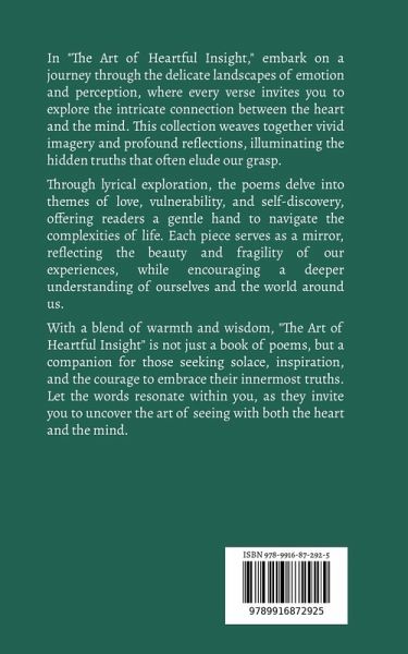 In "The Art of Heartful Insight," embark on a journey through the delicate landscapes of emotion and perception, where every verse invites you to explore the intricate connection between the heart and the mind. This collection weaves together vivid imagery and profound reflections, illuminating the hidden truths that often elude our grasp. Through lyrical exploration, the poems delve into themes of love, vulnerability, and self-discovery, offering readers a gentle hand to navigate the complexities of life. Each piece serves as a mirror, reflecting the beauty and fragility of our experiences, while encouraging a deeper understanding of ourselves and the world around us. With a blend of warmth and wisdom, "The Art of Heartful Insight" is not just a book of poems, but a companion for those seeking solace, inspiration, and the courage to embrace their innermost truths. Let the words resonate within you, as they invite you to uncover the art of seeing with both the heart and the mind.