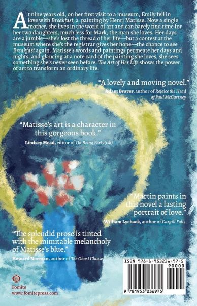 At nine years old, on her first visit to a museum, Emily fell in love with Breakfast, a painting by Henri Matisse. Now a single mother, she lives in the world of art and can barely find time for her two daughters, much less for Mark, the man she loves. Her days are a jumble-she's lost the thread of her life-but a contest at the museum where she's the registrar gives her hope-the chance to see Breakfast again. Matisse's words and paintings permeate her days and nights, and glancing at a note card of the painting she loves, she sees something she's never seen before. The Art of Her Life shows the power of art to transform an ordinary life.