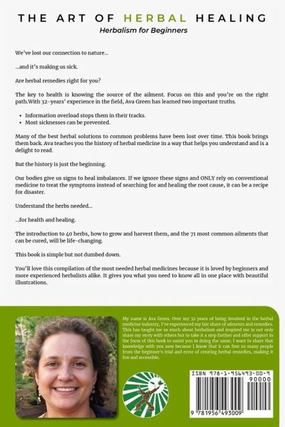 If you want to reconnect with nature and discover the healing power of herbs then keep reading... The truth is... our bodies give us signs to heal imbalances. But if we ignore these signs and ONLY rely on conventional drugs to cover up the symptoms instead of searching for and managing the root cause, it can be a recipe for disaster. You will learn:The ONE Herb You Need to Calm Your Nerves and Anxiety and How to Make It Into a Tincture or Essential Oil and More... How to Make Your Natural First-Aid Kit The Necessity of Understanding the Anatomy of Herbs 14 Effective Ways to Harness the Essence of Herbs 71 Ailments and Their Herbal Remedies at Your Fingertips The Benefits of Herbalism and What's Important for Your Body 40 Herbs Found In America and Europe, How to Grow, Harvest and Use Them A Simple Strategy to Make Your Dream Home Apothecary Into a Reality If you want to get rid of the ailment, you need to find and treat the root cause. That is possible with medicinal herbs, and this book will show you the way! ¿ Even if you've never made or tried a home remedy, this guide is so fun and easy to follow that you can start making your own herbal medicine in just 10 days. With The Art of Herbal Healing: Herbalism for Beginners, an expert herbalist, Ava Green, will take you on a unique herbal journey where you will learn how to find science-backed natural remedies for your ailments. To help protect YOU and YOUR family. If you never want to rely on pharmaceuticals again, get it now! Scroll up to the top of the page and select "Add to Cart"