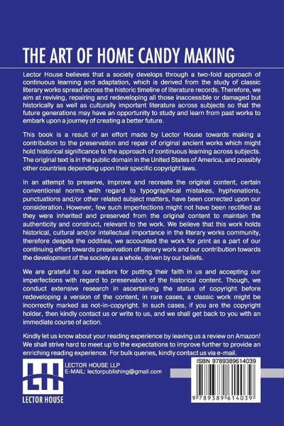The Art Of Home Candy Making This book is a result of an effort made by us towards making a contribution to the preservation and repair of original classic literature. In an attempt to preserve, improve and recreate the original content, we have worked towards: 1. Type-setting & Reformatting: The complete work has been re-designed via professional layout, formatting and type-setting tools to re-create the same edition with rich typography, graphics, high quality images, and table elements, giving our readers the feel of holding a 'fresh and newly' reprinted and/or revised edition, as opposed to other scanned & printed (Optical Character Recognition - OCR) reproductions. 2. Correction of imperfections: As the work was re-created from the scratch, therefore, it was vetted to rectify certain conventional norms with regard to typographical mistakes, hyphenations, punctuations, blurred images, missing content/pages, and/or other related subject matters, upon our consideration. Every attempt was made to rectify the imperfections related to omitted constructs in the original edition via other references. However, a few of such imperfections which could not be rectified due to intentional\unintentional omission of content in the original edition, were inherited and preserved from the original work to maintain the authenticity and construct, relevant to the work. We believe that this work holds historical, cultural and/or intellectual importance in the literary works community, therefore despite the oddities, we accounted the work for print as a part of our continuing effort towards preservation of literary work and our contribution towards the development of the society as a whole, driven by our beliefs. We are grateful to our readers for putting their faith in us and accepting our imperfections with regard to preservation of the historical content. HAPPY READING!