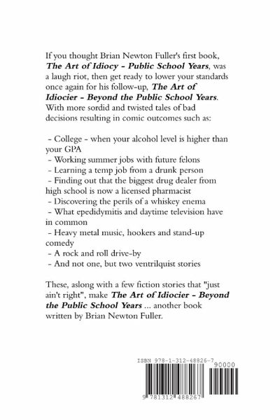 If you thought Brian Newton Fuller's first book, The Art of Idiocy - Public School Years, was a laugh riot, then get ready to lower your standards once again for his follow-up, The Art of Idiocier - Beyond the Public School Years. With more sordid and twisted tales of bad decisions resulting in comic outcomes such as: - College - when your alcohol level is higher than your GPA - Working summer jobs with future felons - Learning a temp job from a drunk person - Finding out that the biggest drug dealer from high school is now a licensed pharmacist - Discovering the perils of a whiskey enema - What epididymitis and daytime television have in common - Heavy metal music, hookers and stand-up comedy - A rock and roll drive-by - And not one, but two ventriloquist stories. These, along with a few fiction stories that "just ain't right", make The Art of Idiocier - Beyond the Public School Years ... another book written by Brian Newton Fuller.