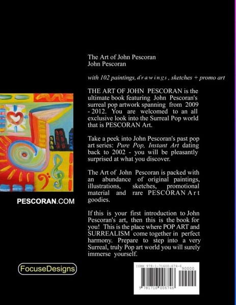 The Art of John Pescoran is packed with an abundance of original and official PESCORAN Art material! Get inside look at rare and one-of-a-kind paintings, drawings and even sketches. Take a peek at earlier artwork by John Pescoran in the "Pure Pop, Instant Art" section of the book - you will be pleasantly surprised at what you will find. Also featured in this book is a huge collection of Pescoran Art promotional material that has been used extensively to promote art series'. If this is your first introduction to The Art of John Pescoran, than this is the book for you! John Pescoran combines Pop-art and Surrealism in perfect harmony!