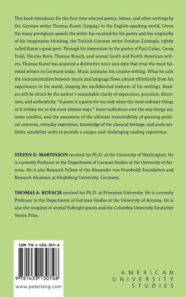 This book introduces for the first time selected poetry, letters, and other writings by the German writer Thomas Kunst (Leipzig) to the English-speaking world. Given the many prestigious awards the writer has received for his poetry and the originality of his imaginative thinking, the Turkish-German writer Feridun Zaimoglu rightly called Kunst a great poet. Through his immersion in the poetry of Paul Celan, Georg Trakl, Nicolas Born, Thomas Brasch, and several South and North American writers, Thomas Kunst has acquired a distinctive voice and style that rival the most talented writers in Germany today. Music animates his creative writing. What he calls the instrumentation between music and language flows almost effortlessly from his experiences in the world, shaping the multifaceted textures of his writings. Readers will be struck by the author's remarkable clarity of expression, precision, directness, and authenticity. "A poem is a poem for me only when the most ordinary things in it irritate me in the most intense ways." Inner turbulence over the way things are, outer conflict, and the awareness of the ultimate irresolvability of pressing political concerns, everyday experience, knowledge of the classical heritage, and acute aesthetic sensibility unite to provide a unique and challenging reading experience.