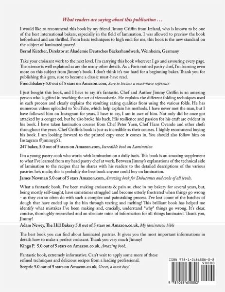 Jimmy Griffin a, is a sixth-generation master baker from Galway Ireland. He has forty years of experience in the bakery industry, growing up in the family business. He is a specialist in viennoiserie, sourdough, bread and cake production. He is a lecturer at the School of Culinary Arts and Food Technology at TU Dublin, Ireland. He holds a Masters Degree in Food Product Development and Culinary Innovation. He is also a regular visitor to The School of Artisan Food at Welbeck in the UK and the Deutsches Baker Akademie in Weinheim, Germany, where he teaches laminated and non-laminated Viennoiserie. Jimmy regularly teaches and judges globally and, in recent times, has demonstrated and given classes in Brazil, Japan, Taipei, Iceland, Spain, France, Germany, Belgium, Poland, Croatia, Italy, USA and Russia, to name but a few. He also works as an advisor and consultant to industry. Jimmy grew up being competitive and, as an apprentice, won many national bakery competitions. Later in his career, he represented Ireland and competed in the European Championships as the viennoiserie candidate three times, winning bronze at the Coupe D' Europe de la Boulangerie 1997. He went on to coach the very successful Irish bakery team from 2002 until 2005. Jimmy has also been an international bakery jury member since 2001 for most of the world championships and world master's competitions, the bakery Olympics of the industry. In 2016, Jimmy was appointed as president of the Jury at the Coupe du Monde de la Boulangerie in Paris. He regularly lectures and teaches overseas and has been involved with baking and competitions in most continents of the world. In 2015, he was also honoured by his Russian colleagues and awarded an Honorary Professorship from Stavropol University in Russia. In May 2019, he came out of competitive retirement to compete in the Coupe du Monde Chocolatine in Toulouse, France, winning the world silver medal for his creations in hand-laminated pastry at the event. He is very active on social media platforms and regularly updates his pages with exciting recipes, procedures, and products. Married to his wife Bogna, Jimmy has three children: Dillon (24), Janice (23) and Sophie (15) (2021). In addition to his test-baking passion, Jimmy is a licenced fixed-wing pilot, an aerobatic pilot, a seaplane pilot, a judo blackbelt instructor, a divemaster and a former marathon runner. He is also a qualified flight instructor. He enjoys writing, and his honours degree dissertation titled "An investigative study into the beneficial use of seaweed in bread and the broader food industry" has been viewed and downloaded over 6000 times. He has published 5 books on bakery recipes and methods in the last 15 months. He is the former President of the Alliance for Bakery Students and Trainees ABST and has been a jury member at the annual student competitions for over seven years. Jimmy is committed to the education of the youth as he sees the future of the industry in the hands of the youth and enjoys passing on and sharing his knowledge with them all. The Art of Lamination is not only a book, it is supported, complemented and updated with an array of social media platforms. Jimmy's YouTube channel http://www.youtube.com/c/JimmyGriffinbaking has videos of many of the aspects of the book. Jimmy's website, http://jimmyg.ie, has a wealth of information on baking and lamination, and his vibrant personal FaceBook page is updated daily. https://www.facebook.com/jimmy.griffin.378. In addition, he has Instagram accounts @jimmyg51, @theartoflamination and a FaceBook page https://www.facebook.com/theartoflamination/ dedicated to the books.
