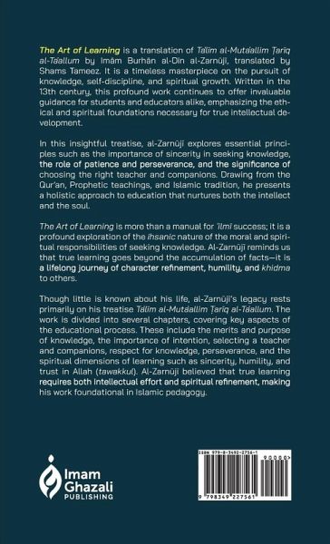 The Art of Learning is a translation of Täl¿m al-Mutäallim ¿ar¿q al-Täallum by Im¿m Burh¿n al-D¿n al-Zarn¿j¿, translated by Shams Tameez. It is a timeless masterpiece on the pursuit of knowledge, self-discipline, and spiritual growth. Written in the 13th century, this profound work continues to offer invaluable guidance for students and educators alike, emphasizing the ethical and spiritual foundations necessary for true intellectual development. In this insightful treatise, al-Zarn¿j¿ explores essential principles such as the importance of sincerity in seeking knowledge, the role of patience and perseverance, and the significance of choosing the right teacher and companions. Drawing from the Qur'an, Prophetic teachings, and Islamic tradition, he presents a holistic approach to education that nurtures both the intellect and the soul. The Art of Learning is more than a manual for ¿ilm¿ success; it is a profound exploration of the ihsanic nature of the moral and spiritual responsibilities of seeking knowledge. Al-Zarn¿j¿ reminds us that true learning goes beyond the accumulation of facts - it is a lifelong journey of character refinement, humility, and khidma to others. Though little is known about his life, al-Zarn¿j¿'s legacy rests primarily on his treatise Täl¿m al-Mutäallim ¿ar¿q al-Täallum. The work is divided into several chapters, covering key aspects of the educational process. These include the merits and purpose of knowledge, the importance of intention, selecting a teacher and companions, respect for knowledge, perseverance, and the spiritual dimensions of learning such as sincerity, humility, and trust in Allah (tawakkul). Al-Zarn¿j¿ believed that true learning requires both intellectual effort and spiritual refinement, making his work foundational in Islamic pedagogy.