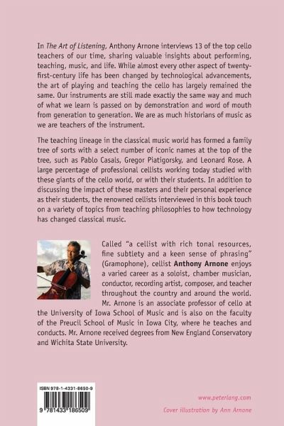 In The Art of Listening, Anthony Arnone interviews 13 of the top cello teachers of our time, sharing valuable insights about performing, teaching, music, and life. While almost every other aspect of twenty-first-century life has been changed by technological advancements, the art of playing and teaching the cello has largely remained the same. Our instruments are still made exactly the same way and much of what we learn is passed on by demonstration and word of mouth from generation to generation. We are as much historians of music as we are teachers of the instrument.