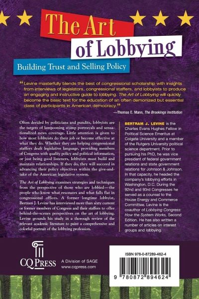 Often the whipping boys of politicians and pundits, lobbyists are the recipients of lampooning stump portrayals and sensationalized news coverage. Little attention is given to how most lobbyists simply do their job or become effective at what they do. Whether it&BAD:rsquo;s helping staff draft legislative language, providing members with quality policy and political information, or just being a good listener, lobbyists must build and maintain relationships. If they do, they&BAD:rsquo;ll succeed in advancing their policy objectives within the give-and-take process of the American legislative system. The Art of Lobbying examines strategies and techniques from the perspective of those who are lobbied&BAD:mdash;the people who know what resonates and what falls upon deaf ears in congressional offices. A former longtime lobbyist himself, Levine has interviewed more than 40 current or former members of Congress, along with their staffers, to give a thorough review of the relevant academic literature and offer a behind-the-scenes perspective on what constitutes the art of lobbying.
