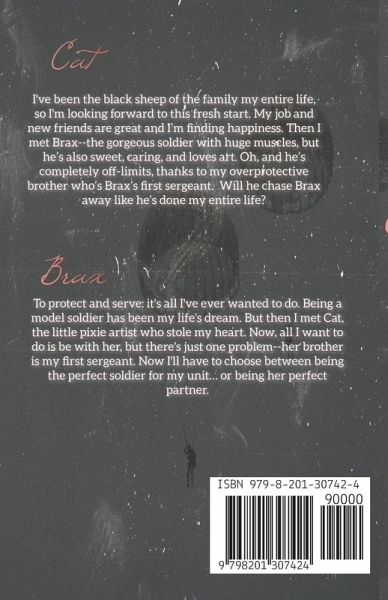 Cat I've been the black sheep of the family my entire life, so I'm looking forward to this fresh start. My job and new friends are great and I'm finding happiness. Then I met Brax--the gorgeous soldier who works with my overprotective brother. Brax is gorgeous with muscles in all the right places, but he's also sweet, caring, and loves art. Oh, and he's completely off-limits, thanks to my brother. Will he chase Brax away like he's done my entire life? Brax To protect and serve: it's all I've ever wanted to do. Being a model soldier has been my life's dream. But then I met Cat, the little pixie artist who stole my heart. Now, all I want to do is be with her, but there's just one problem--her brother is my first sergeant. Now I'll have to choose between being the perfect soldier for my unit… or being her perfect partner