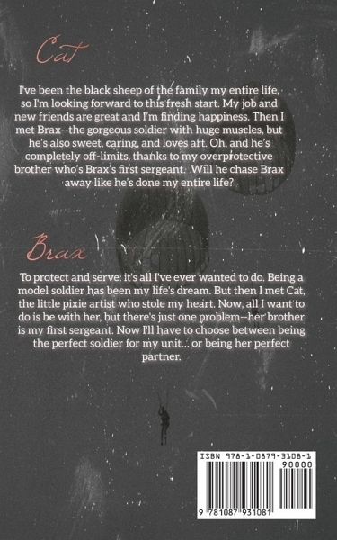 One look is all it takes to change everything. Cat I've been the black sheep of the family my entire life, so I'm looking forward to this fresh start. My new independent life. My job and new friends are great and I'm finding happiness. Then I met Brax--the gorgeous soldier with huge muscles. A sweet, gentle guy that adores his autistic sister. Bonus he draws! Oh, and he's completely off-limits, thanks to my overprotective brother, Mike who's Brax's first sergeant and one of his closest friends. Will he chase Brax away like he's done my entire life? Brax To protect and serve: it's all I've ever wanted to do. Being a model soldier has been my life's dream, there's nothing better than completing Airborne jumps or repelling out of helicopters or base jumping. But then I met Cat, the little pixie artist who stole my heart and schooled me on pencils. Somehow, she slows me slow down-calms me. Now, all I want to do is be with her, but there's just one problem--her brother is my first sergeant and one of my closest friends. I'll have to choose between being the perfect soldier for my unit... or being her perfect partner.