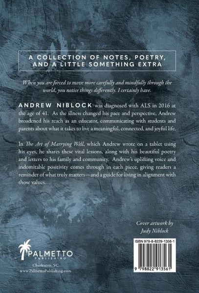 A Collection of Notes, Poetry, And A Little Something Extra When you are forced to move more carefully and mindfully through the world, you notice things differently. I certainly have. Andrew Niblock was diagnosed with ALS in 2016 at the age of 41. As the illness changed his pace and perspective, Andrew broadened his reach as an educator, communicating with students and parents about what it takes to live a meaningful, connected, and joyful life. In The Art of Marrying Well, which Andrew wrote on a tablet using his eyes, he shares these vital lessons, along with his beautiful poetry and letters to his family and community. Andrew's uplifting voice and indomitable positivity comes through in each piece, giving readers a reminder of what truly matters-and a guide for living in alignment with those values.