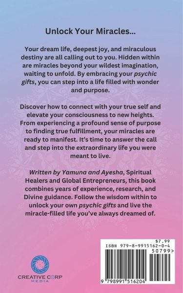 Unlock Your Miracles... Your dream life, deepest joy, and miraculous destiny are all calling out to you. Hidden within are miracles beyond your wildest imagination, waiting to unfold. By embracing your psychic gifts, you can step into a life filled with wonder and purpose. Discover how to connect with your true self and elevate your consciousness to new heights. From experiencing a profound sense of purpose to finding true fulfillment, your miracles are ready to manifest. It's time to answer the call and step into the extraordinary life you were meant to live. Written by Yamuna and Ayesha, Spiritual Healers and Global Entrepreneurs, this book combines years of experience, research, and Divine guidance. Follow the wisdom within to unlock your own psychic gifts and live the miracle-filled life you've always dreamed of!