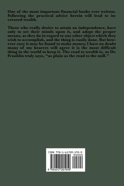 One of the most important financial books ever written. Following the practical advice herein will lead to increased wealth. Those who really desire to attain an independence, have only to set their minds upon it, and adopt the proper means, as they do in regard to any other object which they wish to accomplish, and the thing is easily done. But however easy it may be found to make money, I have no doubt many of my hearers will agree it is the most difficult thing in the world to keep it. The road to wealth is, as Dr. Franklin truly says, "as plain as the road to the mill." Wilder Publications is a green publisher. All of our books are printed to order. This reduces waste and helps us keep prices low while greatly reducing our impact on the environment.