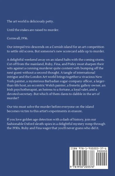 The art world is deliciously petty. Until the stakes are raised to murder. Cornwall, 1936. Our intrepid trio descends on a Cornish island for an art competition to settle old scores. But someone's new scorecard adds up to murder. A delightful weekend away on an island halts with the coming storm. Cut off from the mainland, Ruby, Fina, and Pixley must sharpen their wits against a cunning murderer quite content with bumping off the next guest without a second thought. A tangle of international intrigue and the London Art world brings together a vivacious New York painter, a mysterious Barbadian sugar-company officer, a larger-than-life host, an eccentric Welsh painter, a frenetic gallery owner, an Irish psychotherapist, an heiress to a fortune, a loyal valet, and a devoted secretary. But which of them dares to dabble in the art of murder? Our trio must solve the murder before everyone on the island becomes victim to this artist's experiments in erasure. If you love golden age detection with a dash of history, join our fashionable Oxford sleuth-spies in a delightful mystery romp through the 1930s. Ruby and Fina wager that you'll never guess who did it.