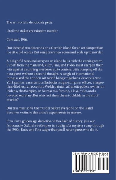 The art world is deliciously petty. Until the stakes are raised to murder. Cornwall, 1936. Our intrepid trio descends on a Cornish island for an art competition to settle old scores. But someone's new scorecard adds up to murder. A delightful weekend away on an island halts with the coming storm. Cut off from the mainland, Ruby, Fina, and Pixley must sharpen their wits against a cunning murderer quite content with bumping off the next guest without a second thought. A tangle of international intrigue and the London Art world brings together a vivacious New York painter, a mysterious Barbadian sugar-company officer, a larger-than-life host, an eccentric Welsh painter, a frenetic gallery owner, an Irish psychotherapist, an heiress to a fortune, a loyal valet, and a devoted secretary. But which of them dares to dabble in the art of murder? Our trio must solve the murder before everyone on the island becomes victim to this artist's experiments in erasure. If you love golden age detection with a dash of history, join our fashionable Oxford sleuth-spies in a delightful mystery romp through the 1930s. Ruby and Fina wager that you'll never guess who did it.