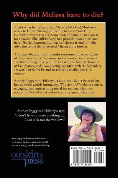 Why did Melissa have to die? That's what her older sister, Micaela (Mickey) Moskowitz wants to know. Mickey, a prominent New York City journalist, returns to her hometown of Santa Fe in a quest for answers. She enlists Berg, her physicist paramour, and fiery District Attorney Lupita, her closest friend, to help solve the crime that shattered Mickey's life forever. This trail-blazing trio of sleuths encounter an eclectic cast of characters, some charming and eccentric, some sinister and threatening. The plot interweaves the high-tech world of Los Alamos and a swaggering scientist with the legendary art world of Santa Fe and an ethically challenged U.S. senator. Author Peggy van Hulsteyn, a long-time Santa Fe resident, knows these worlds intimately. The Art of Murder is a smart, engaging, and entertaining novel for readers who love eccentric New Mexico and who enjoy a good whodunit.