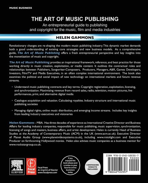 Chapter 1 Turning music into a business Chapter 2 Understanding copyright Chapter 3 Managing rights - international framework and issues Chapter 4 The role of the music publisher Chapter 5 Income streams Chapter 6 Introduction to contracts Chapter 7 Synchronization Chapter 8 Getting a publishing deal Chapter 9 UK and international trade shows Chapter 10 Networking - building a sustainable network Chapter 11 The producer and the song, Rod Gammons Chapter 12 Change in the digital space Chapter 13 Purchasing a catalogue Chapter 14 Business and strategic planning Chapter 15 Corporate social responsibility in the twenty-first century - making the case for business responsibility in the creative industries