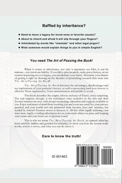 The Art of Passing the Buck offers a simple, comprehensive explanation of how Wills and Trusts work. It reveals wealth retention, management and empowerment techniques you can use to build a family dynasty. Inheritance may often degenerate into legal battles, and/or dark whisperings among relatives. Who was cared for or neglected comes to the fore when reading the Will or setting up the Trust. Sometimes, siblings battle among themselves over who gets what, while parents become distraught making the myriad decisions related to their own passing. We explain how there can be a smooth transition when both Grantors and Beneficiaries have vital information. A must read for both givers and receivers of wealth, this book also covers: the history of Trusts, Trust types, Trustees and the law, privacy, who should not have a Trust, parenting and perpetual wealth, and heirs: the favored and the flawed. Emphasis throughout is on what works in the real world, based on decades of experience.