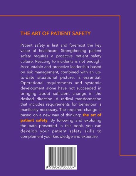 Patient safety is first and foremost the key value of healthcare. Strengthening patient safety requires a proactive patient safety culture. Reacting to incidents is not enough. Accountable and proactive leadership based on risk management, combined with an up-to-date situational picture, is essential. Operational requirements and systemic development alone have not succeeded in bringing about sufficient change in the desired direction. A radical transformation that includes requirements for behaviour is manifestly necessary. The required change is based on a new way of thinking: the art of patient safety. By following and exploring the path presented in this book, you can develop your patient safety skills to complement your knowledge and expertise.