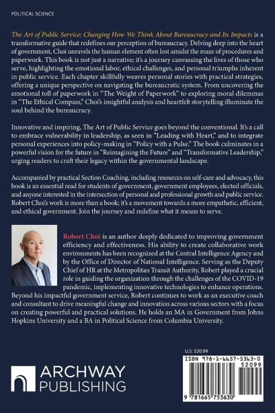 The Art of Public Service: Changing How We Think About Bureaucracy and Its Impacts is a transformative guide that redefines our perception of bureaucracy. Delving deep into the heart of government, Choi unravels the human element often lost amidst the maze of procedures and paperwork. This book is not just a narrative; it's a journey canvassing the lives of those who serve, highlighting the emotional labor, ethical challenges, and personal triumphs inherent in public service. Each chapter skillfully weaves personal stories with practical strategies, offering a unique perspective on navigating the bureaucratic system. From uncovering the emotional toll of paperwork in "The Weight of Paperwork" to exploring moral dilemmas in "The Ethical Compass," Choi's insightful analysis and heartfelt storytelling illuminate the soul behind the bureaucracy. Innovative and inspiring, The Art of Public Service goes beyond the conventional. It's a call to embrace vulnerability in leadership, as seen in "Leading with Heart," and to integrate personal experiences into policy-making in "Policy with a Pulse." The book culminates in a powerful vision for the future in "Reimagining the Future" and "Transformative Leadership," urging readers to craft their legacy within the governmental landscape. Accompanied by practical Section Coaching, including resources on self-care and advocacy, this book is an essential read for students of government, government employees, elected officials, and anyone interested in the intersection of personal and professional growth and public service. Robert Choi's work is more than a book; it's a movement towards a more empathetic, efficient, and ethical government. Join the journey and redefine what it means to serve.