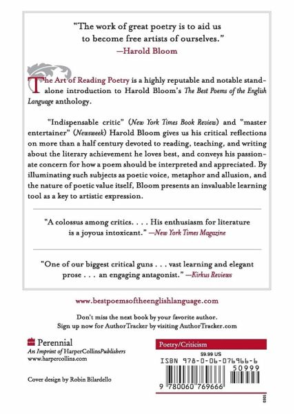 A paperback original, Bloom's stand-alone introduction to The Best Poems of the English Language. A notable feature of Harold Bloom's poetry anthology The Best Poems English Language is his lengthy introductory essay, here reprinted as a separate book. For the first time Bloom gives his readers an elegant guide to reading poetry--a master critic's distillation of a lifetime of teaching and criticism. He tackles such subjects as poetic voice, the nature of metaphor and allusion, and the nature of poetic value itself. Bloom writes "the work of great poetry is to aid us to become free artists of ourselves." This essay is an invaluable guide to poetry. This edition will also include a recommended reading list of poems.