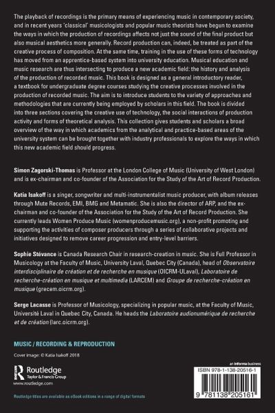Simon Zagorski-Thomas is Professor at the London College of Music (University of West London) and is ex-chairman and co-founder of the Association for the Study of the Art of Record Production. Katia Isakoff is a singer, songwriter and multi-instrumentalist music producer, with album releases through Mute Records, EMI, BMG, Universal, Metamatic, and Altersonic Sound (a co-owned label and studio: altersonicsound.com). Sophie Stévance is Canada Chair Research in research-creation in music. She is professor in musicology at the Faculty of Music, University Laval, Quebec City (Canada), head of Observatoire interdisciplinaire de création et de recherche en musique (OICRM-ULaval), Laboratoire de recherche-création en musique et multimedia (LARCEM) and Groupe de recherche-création en musique (grecem.oicrm.org). Serge Lacasse is professor of musicology, specializing in popular music, at the Faculty of Music, Université Laval in Quebec City, Canada. He heads the Laboratoire audionumérique de recherche et de création (larc.oicrm.org).