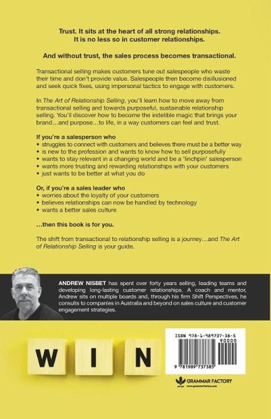 We need trusting, customer-supplier relationships now more than ever. Technology allows us to understand customers far better at a data level and gives us myriad new ways to communicate. But this explosion of data and technology also creates noise; noise we have to cut through to find trust. Trust. It sits at the heart of all strong relationships. It is no less so in customer relationships. And without trust, the sales process becomes transactional. The dynamics of a technology-based, fast-paced, commercially oriented world cause many salespeople to fall into the transactional-selling trap. Customers tune out salespeople who waste their time and don't provide value. As a result, salespeople become disillusioned with the profession and seek quick fixes and less personal tactics to engage with customers. The Art of Relationship Selling teaches salespeople to move away from transactional selling and toward purposeful, sustainable relationship selling to become the indelible magic that brings their brand...and purpose...to life, in a way customers can feel and trust. If you're a salesperson who:Finds it harder to connect with customers and believes there must be a better way Is new to the profession and wants to know how to sell purposefully Wants to stay relevant in a changing world and be a 'linchpin' salesperson Wants more trusting and rewarding relationships with your customers Just wants to be better at what you do ...then this book is for you. If you are a sales leader who:Worries about the loyalty of your customers Believes relationships can now be handled by technology Wants a better sales culture ...then this book is for you. The shift from transactional selling to the art of relationship selling is a journey...and this book is your map.