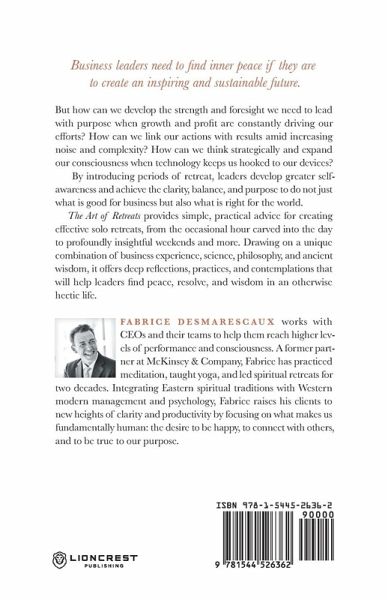 Business leaders need to find inner peace if they are to create an inspiring and sustainable future. But how can we develop the strength and foresight we need to lead with purpose when growth and profit are constantly driving our efforts? How can we link our actions with results amid increasing noise and complexity? How can we think strategically and expand our consciousness when technology keeps us hooked to our devices? By introducing periods of retreat, leaders develop greater self-awareness and achieve the clarity, balance, and purpose to do not just what is good for business but also what is right for the world. The Art of Retreats provides simple, practical advice for creating effective solo retreats, from the occasional hour carved into the day to profoundly insightful weekends and more. Drawing on a unique combination of business experience, science, philosophy, and ancient wisdom, it offers deep reflections, practices, and contemplations that will help leaders find peace, resolve, and wisdom in an otherwise hectic life.