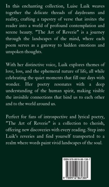 In this enchanting collection, Luise Luik weaves together the delicate threads of daydreams and reality, crafting a tapestry of verse that invites the reader into a world of profound contemplation and serene beauty. "The Art of Reverie" is a journey through the landscapes of the mind, where each poem serves as a gateway to hidden emotions and unspoken thoughts. With her distinctive voice, Luik explores themes of love, loss, and the ephemeral nature of life, all while celebrating the quiet moments that fill our days with wonder. Her poetry resonates with a deep understanding of the human spirit, making visible the invisible connections that bind us to each other and to the world around us. Perfect for fans of introspective and lyrical poetry, "The Art of Reverie" is a collection to cherish, offering new discoveries with every reading. Step into Luik's reveries and find yourself transported to a realm where words paint vivid landscapes of the soul. Copyright (c) 2024 Swan Charm Publishing
