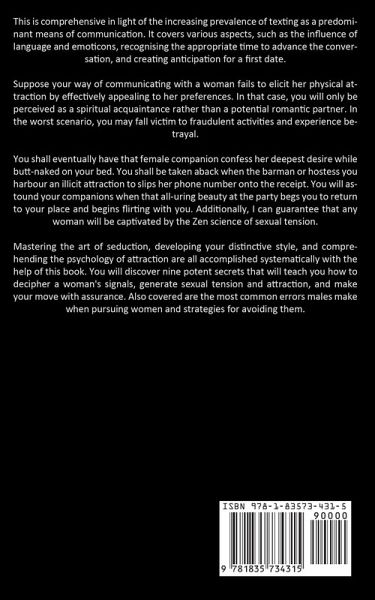 This is comprehensive in light of the increasing prevalence of texting as a predominant means of communication. It covers various aspects, such as the influence of language and emoticons, recognising the appropriate time to advance the conversation, and creating anticipation for a first date. Suppose your way of communicating with a woman fails to elicit her physical attraction by effectively appealing to her preferences. In that case, you will only be perceived as a spiritual acquaintance rather than a potential romantic partner. In the worst scenario, you may fall victim to fraudulent activities and experience betrayal. You shall eventually have that female companion confess her deepest desire while butt-naked on your bed. You shall be taken aback when the barman or hostess you harbor an illicit attraction to slips her phone number onto the receipt. You will astound your companions when that all-uring beauty at the party begs you to return to your place and begins flirting with you. Additionally, I can guarantee that any woman will be captivated by the Zen science of sexual tension. Mastering the art of seduction, developing your distinctive style, and comprehending the psychology of attraction are all accomplished systematically with the help of this book. You will discover nine potent secrets that will teach you how to decipher a woman's signals, generate sexual tension and attraction, and make your move with assurance. Also covered are the most common errors males make when pursuing women and strategies for avoiding them.