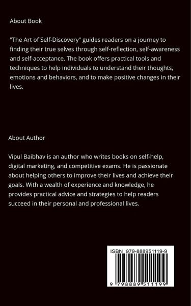 The art of self-discovery is about taking the time to get to know oneself and to unlock one's true potential. It involves deep reflection and exploring one's thoughts, feelings, beliefs, and behaviors. This process can help individuals become more aware of who they are and how they interact with the world. By examining one's life experiences, a person can better understand their motivations and how they can create positive change within themselves. Self-discovery can also help people reach greater levels of success by revealing their passions and purpose in life. Additionally, it can foster a deeper sense of understanding and appreciation for oneself. In this fast-paced world where we are constantly on the go, it can be easy to lose sight of who we are and what we want out of life. Vipul Baibhav's book, ""The Art of Self-Discovery: A Journey to Finding Your True Self,"" offers a much-needed reminder to take a step back, to reflect, and to understand ourselves better. Through practical techniques and strategies, this book guides readers on a journey of self-discovery and personal growth.