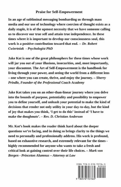 In an age of subliminal messaging bombarding us through mass media and our use of technology where coercion of thought exists as a daily staple, it is of the upmost necessity that we have someone calling us to discover our true self and attain true independence. In these times where it is important to develop our consciousness soul, this work is a positive contribution toward that end. -- Dr. Robert Cwiertniak - Psychologist PhD Jake Kot is one of the great philosophers for these times whose work will jar you out of your illusions, insecurities, and, most importantly, your discontent. The Art of Self-Empowerment is the handbook for living through your power, and seeing the world from a different lens - one where you can create, thrive, and enjoy the journey. - Sherry Prindle, Founder of the Professional Coach Academy Jake Kot takes you on an other-than-linear journey where you delve into the bounds of purpose, potentiality and possibility to empower you to define yourself, and unleash your potential to make the kind of decisions that render not only utility in your day-to-day, but the kind of joy that makes you think, 'I get to do this' instead of 'I have to make the doughnuts'. - Rev. D. Christian Anderson Mr. Kot's book makes the reader think hard about the deeper questions we're facing, and in doing so brings clarity to the things we need to personally and professionally address. His work is profound, based on exhaustive research, and extremely relevant for the times - highly recommended for anyone who wants to take a fresh and critical look at gaining control over their life choices. - Mark von Bergen - Princeton Alumnus - Attorney at Law
