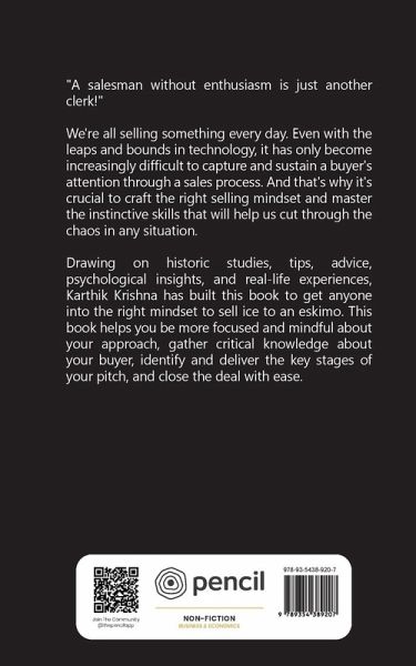 ""A salesman without enthusiasm is just another clerk!"" We're all selling something every day. Even with the leaps and bounds in technology, it has only become increasingly difficult to capture and sustain a buyer's attention through a sales process. And that's why it's crucial to craft the right selling mindset and master the instinctive skills that will help us cut through the chaos in any situation. Drawing on historic studies, tips, advice, psychological insights, and real-life experiences, Karthik Krishna has built this book to get anyone into the right mindset to sell ice to an eskimo. This book helps you be more focused and mindful about your approach, gather critical knowledge about your buyer, identify and deliver the key stages of your pitch, and close the deal with ease.
