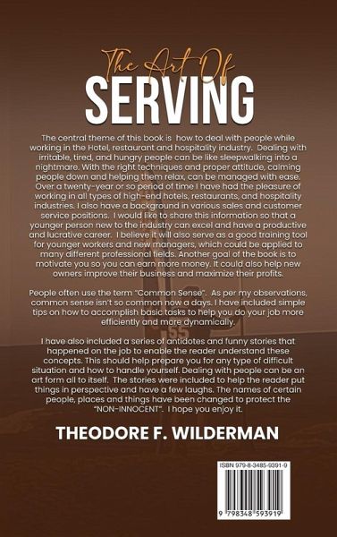 The central theme of this book is how to deal with people while working in the Hotel, restaurant and hospitality industry. Dealing with irritable, tired, and hungry people can be like sleepwalking into a nightmare. With the right techniques and proper attitude, calming people down and helping them relax, can be managed with ease. Over a twenty-year or so period of time I have had the pleasure of working in all types of high-end hotels, restaurants, and hospitality industries. I also have a background in various sales and customer service positions. I would like to share this information so that a younger person new to the industry can excel and have a productive and lucrative career. I believe it will also serve as a good training tool for younger workers and new managers, which could be applied to many different professional fields. Another goal of the book is to motivate you so you can earn more money. It could also help new owners improve their business and maximize their profits. People often use the term "Common Sense". As per my observations, common sense isn't so common now a days. I have included simple tips on how to accomplish basic tasks to help you do your job more efficiently and more dynamically. I have also included a series of antidotes and funny stories that happened on the job to enable the reader understand these concepts. This should help prepare you for any type of difficult situation and how to handle yourself. Dealing with people can be an art form all to itself. The stories were included to help the reader put things in perspective and have a few laughs. The names of certain people, places and things have been changed to protect the "NON-INNOCENT". I hope you enjoy it.