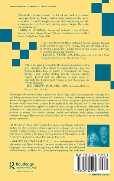 In "The Art of Strategic Therapy," the reader can for the first time experience Jay Haley's progressing work from weekly sessions with a training group where he discusses supervisory diagnostics and interview planning, and offers line directives and case debriefings. He personally handles a variety of techniques in treating depression, violence, and psychosis in therapy with couples, children, families and different ethnic groups. Anthropologist Madeleine Richeport-Haley provides critical analysis of the cultural backgrounds of the various ethnic groups in treatment. Visit www.haley-therapies.com for additional resources by Jay Haley, including live videos of the pioneering therapist in action.
