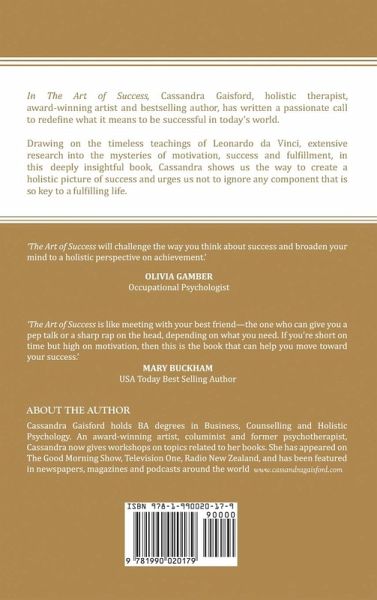 Define Success On Your Own Terms. Overcome Seemingly Insurmountable Obstacles Being successful is not just about money. It's also about health, happiness, close relationships, doing something meaningful and enjoying life's journey. Self-doubt, fear of failure, the need for approval, low self-esteem, lack of confidence, perfectionism, overwhelm, feeling unsupported, financial worries and other increasingly difficult and seemingly insurmountable obstacles can stop you from achieving success. When you're experiencing these things, it can feel like you're failing and alone. But in truth, they are part of the success process, and every successful person, including Leonardo da Vinci experiences challenging setbacks too. Master the art of success. Be inspired by success stories of extraordinary artists like Leonardo da Vinci. Find your beauty spot and harness the transformational energy zone where creativity, science and commerce intersect. Amazon #1 bestselling author and success expert Cassandra Gaisford (BCA, Dip Psych) provides simple but powerful and easy to implement steps to achieve authentic success. Based on survey research, personal achievements and her professional expertise and success as an award-winning artist, best selling author, and holistic therapist, Gaisford answers the question: how to create a happier life and succeed more. In The Art of Success: How Extraordinary Artists Can Help You Succeed in Business and Life, you'll learn: How to set and achieve exciting and audacious goals How to define success on your own terms, find your truth, gain your freedom and live an authentic life Why successful people like Leonardo work with passion and purpose How to identify your REAL priorities How to challenge and redefine the way you think about success How to overcome blocks, including fear-of failure, of success, of change, of criticism or imperfection-and shift ingrained, sabotaging beliefs by tapping into the realms where science meets spirituality How to overcome seemingly insurmountable obstacles, including lack of finances, procrastination and low self-esteem How to broaden your mind to a holistic perspective on achievement How to super-charge the confidence needed to make an inspired change How to empower and improve your business and personal life How to follow your passion and still pay the bills How to unravel Leonardo's secrets to success and crack the da Vinci code BONUS: Find Your Passion Workbook Think of The Art of Success: How Extraordinary Artists Can Help You Succeed in Business and Life as triumphing in the war of art... for yourself. If you're short on time but high on motivation, then this is the book that will cheerlead, support, encourage and inspire you to move you toward success. Master the eight principles of success including the importance of: Embracing the call for success Empowering your success Empowering your vision Empowering your spirit Empowering your mind Empowering your body Empowering your relationships Empowering your work Quit struggling and start succeeding. Quicken your spirit, pull back the covers of your soul and open the door to a more authentic and vital you. Pick up your copy today.