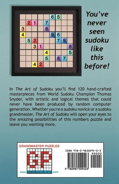 You've never seen Sudoku like this! In The Art of Sudoku you'll find 120 hand-crafted masterpieces from World Sudoku Champion Thomas Snyder, with artistic and logical themes that could never have been produced by random computer generation. Whether you're a sudoku novice or a sudoku grandmaster, The Art of Sudoku will open your eyes to the amazing possibilities of this numbers puzzle and leave you wanting more.