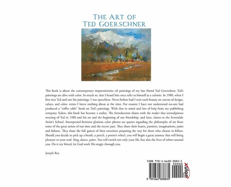 This book is about the contemporary impressionistic oil paintings of my late friend Ted Goerschner. Ted's paintings are alive with color. So much so, that I heard him once refer to himself as a colorist. In 1980, when I first met Ted and saw his paintings, I was speechless. Never before had I seen such beauty on canvas of design, values, and color- terms I knew nothing about at the time. For reasons I have not understood no-one had produced a "coffee table" book on Ted's paintings. With that in mind and lots of help from my publishing company Xulon, this book has become a reality. The Introduction shares with the reader that serendipitous meeting of Ted in 1980 and his art and the beginning of our friendship, and later, classes at the Scottsdale Artist's School. Interspersed between glorious color photos are quotes regarding the philosophy of art from some of the great artists of our time and the recent past. They share their hearts, passions, imaginations, pains and failures. They share the full gamut of their emotions preparing the way for those who choose to follow. Should you decide to pick up a brush, a pencil, a potter's wheel, you will begin a great journey that will bring pleasure to your soul. Sing, dance, paint. You will enrich not only your life, but also the lives of others around you. Do it my friend, let God work His magic through you. Joseph Rea