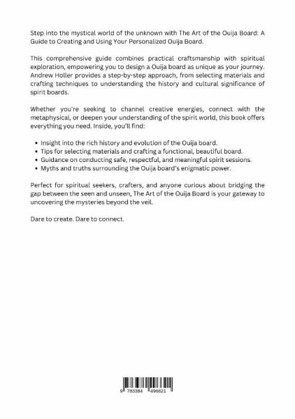 Step into the mystical world of the unknown with The Art of the Ouija Board: A Guide to Creating and Using Your Personalized Ouija Board.This comprehensive guide combines practical craftsmanship with spiritual exploration, empowering you to design a Ouija board as unique as your journey. Andrew Holler provides a step-by-step approach, from selecting materials and crafting techniques to understanding the history and cultural significance of spirit boards.Whether you're seeking to channel creative energies, connect with the metaphysical, or deepen your understanding of the spirit world, this book offers everything you need. Inside, you'll find:Insight into the rich history and evolution of the Ouija board.Tips for selecting materials and crafting a functional, beautiful board.Guidance on conducting safe, respectful, and meaningful spirit sessions.Myths and truths surrounding the Ouija board's enigmatic power.Perfect for spiritual seekers, crafters, and anyone curious about bridgingthe gap be-tween the seen and unseen, The Art of the Ouija Board is your gateway to uncovering the mysteries beyond the veil.Dare to create. Dare to connect.