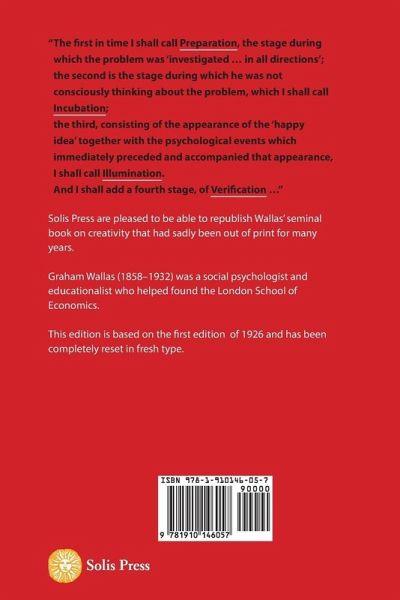 "The first in time I shall call Preparation, the stage during which the problem was 'investigated ... in all directions'; the second is the stage during which he was not consciously thinking about the problem, which I shall call Incubation; the third, consisting of the appearance of the 'happy idea' together with the psychological events which immediately preceded and accompanied that appearance, I shall call Illumination. And I shall add a fourth stage, of Verification ..." Solis Press are pleased to be able to republish Wallas' seminal book on creativity that had sadly been out of print for many years. Graham Wallas (1858-1932) was a social psychologist and educationalist who helped found the London School of Economics. This edition is based on the first edition of 1926 and has been completely reset in fresh type. "Wallas plainly is courgageous, tolerant, keenly observant, and widely experienced in social matters." The Sewanee Review