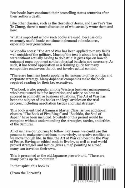 Few books have continued their bestselling status centuries after their author's death. What is important is how such books are used. Because only extremely useful books continue in demand at bookstores, especially over generations. These books have found application as a training guides for many competitive endeavors that do not involve actual combat. This book is entitled A Samurai Master Class, as two additional classics, "The Book of Five Rings" and "Bushido, the Soul of Japan" have been included. No study of this period would be complete without understanding the strategies, tactics, and ethics of the Samurai. All of us have our journey to follow. For some, we could use this persona to make our decisions more wisely, to resolve conflicts as we move though life. In this, the Art of War can become the Way of Peace. This is presented as the old Japanese proverb told, "There are many paths up the mountain." In that spirit, this book is humbly presented for your use. (From the Forward)