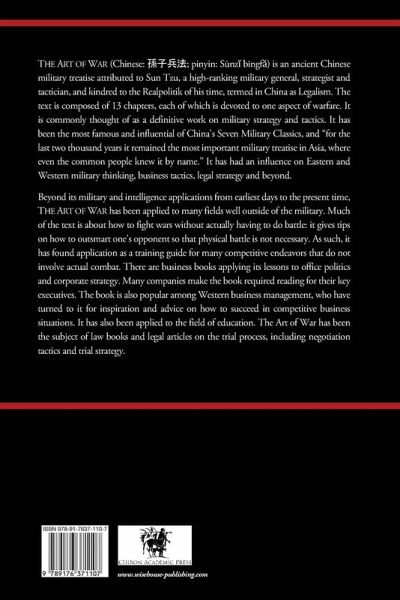 THE ART OF WAR (Chinese: ¿¿¿¿; pinyin: S¿nz¿ b¿ngf¿) is an ancient Chinese military treatise attributed to Sun Tzu, a high-ranking military general, strategist and tactician, and kindred to the Realpolitik of his time, termed in China as Legalism. The text is composed of 13 chapters, each of which is devoted to one aspect of warfare. It is commonly thought of as a definitive work on military strategy and tactics. It has been the most famous and influential of China's Seven Military Classics, and "for the last two thousand years it remained the most important military treatise in Asia, where even the common people knew it by name." It has had an influence on Eastern and Western military thinking, business tactics, legal strategy and beyond. Beyond its military and intelligence applications from earliest days to the present time, THE ART OF WAR has been applied to many fields well outside of the military. Much of the text is about how to fight wars without actually having to do battle: it gives tips on how to outsmart one's opponent so that physical battle is not necessary. As such, it has found application as a training guide for many competitive endeavors that do not involve actual combat. There are business books applying its lessons to office politics and corporate strategy. Many companies make the book required reading for their key executives. The book is also popular among Western business management, who have turned to it for inspiration and advice on how to succeed in competitive business situations. It has also been applied to the field of education. The Art of War has been the subject of law books and legal articles on the trial process, including negotiation tactics and trial strategy.