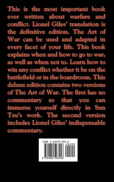 This is the most important book ever written about warfare and conflict. Lionel Giles' translation is the definitive edition. The Art of War can be used and adapted in every facet of your life. This book explains when and how to go to war, as well as when not to. Learn how to win any conflict whether it be on the battlefield or in the boardroom. This deluxe edition contains two versions of The Art of War. The first has no commentary so that you can immerse yourself directly in Sun Tzu's work. The second version includes Lionel Giles' indispensable commentary.