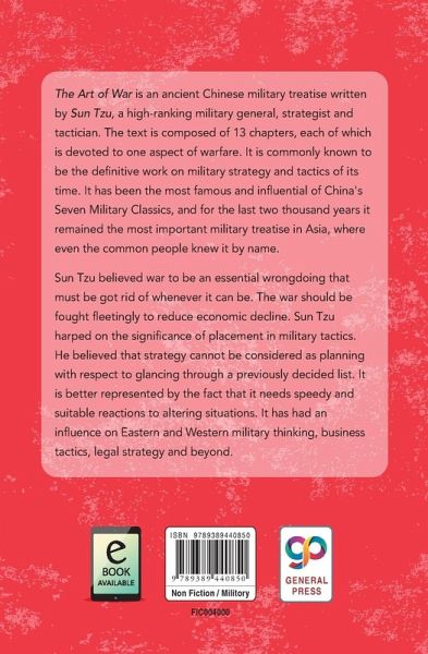 The Art of War' is an ancient Chinese military treatise written by Sun Tzu, a high-ranking military general, strategist and tactician. The text is composed of 13 chapters, each of which is devoted to one aspect of warfare. It is commonly known to be the definitive work on military strategy and tactics of its time. It has been the most famous and influential of China's Seven Military Classics, and for the last two thousand years it remained the most important military treatise in Asia, where even the common people knew it by name. Sun Tzu believed war to be an essential wrongdoing that must be got rid of whenever it can be. The war should be fought fleetingly to reduce economic decline. Sun Tzu harped on the significance of placement in military tactics. The planning to position an army must be dependent on the stipulations in the physical surroundings and the subjective thoughts of various militants in those conditions. He believed that strategy cannot be considered as planning with respect to glancing through a previously decided list. It is better represented by the fact that it needs speedy and suitable reactions to altering situations. Planning gives results in restrained surroundings. But in case of an altering environment, similar plans come in each other's ways and give rise to undesired outcomes. It has had an influence on Eastern and Western military thinking, business tactics, legal strategy and beyond.