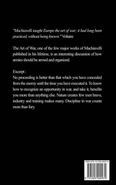 "Machiavelli taught Europe the art of war; it had long been practiced, without being known." Voltaire The Art of War, one of the few major works of Machiavelli published in his lifetime, is an interesting discussion of how armies should be armed and organized. Excerpt : No proceeding is better than that which you have concealed from the enemy until the time you have executed it. To know how to recognize an opportunity in war, and take it, benefits you more than anything else. Nature creates few men brave, industry and training makes many. Discipline in war counts more than fury.
