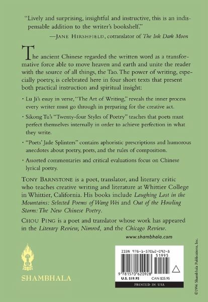 The ancient Chinese regarded the written word as a transformative force able to move heaven and earth and unite the reader with the source of all things, the Tao. The power of writing, especially poetry, is celebrated here in short texts that present both practical instruction and spiritual insight: • Lu Ji's essay in verse, "The Art of Writing," reveals the inner process every writer must go through in preparing for the creative act. • Sikong Tu's "Twenty-four Styles of Poetry" teaches that poets must perfect themselves internally in order to achieve perfection in what they write. • "Poets' Jade Splinters" contains aphoristic prescriptions and humorous anecdotes about poetry, poets, and the rules of composition. Assorted commentaries and critical evaluations focus on Chinese lyrical poetry.