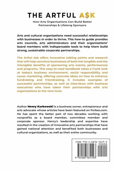 Increase Arts Fundraising. Corporate giving is not the same today as it was just five years ago. This easy-to-read handbook takes a frank look at today's business environment, social responsibility and cause marketing, offering concrete methods on how the arts can leverage them to their benefit. The Artful Ask includes examples of successful partnerships, as well as interviews with business executives who have taken their partnerships with arts organizations and their sponsorships to the next level. Arts and cultural organizations need successful relationships with businesses in order to thrive. This how-to guide provides arts councils, arts administrators and their organizations' board members with indispensable tools to help them build strong, sustainable arts sponsorships and corporate partnerships. This book is a must-read before going on your next corporate ask. A resource for arts and cultural organizations to get better sponsorships from corporate partners. This book details how to strengthen sustainability and thrive through deeper sponsor relationships. The Artful Ask contains important research, interviews with corporate executives and offers real world examples of successful arts partnerships from around the nation.